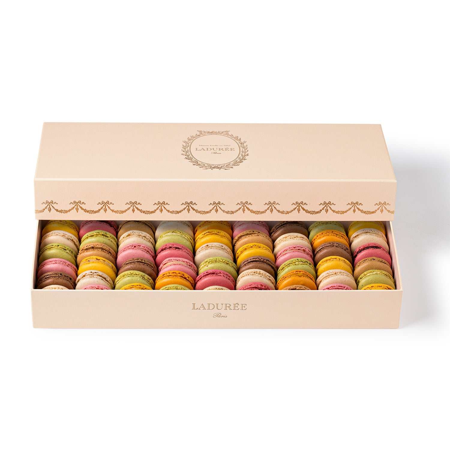 Gift box of 54 assorted peach macarons in elegant Ladurée packaging for in-store pickup